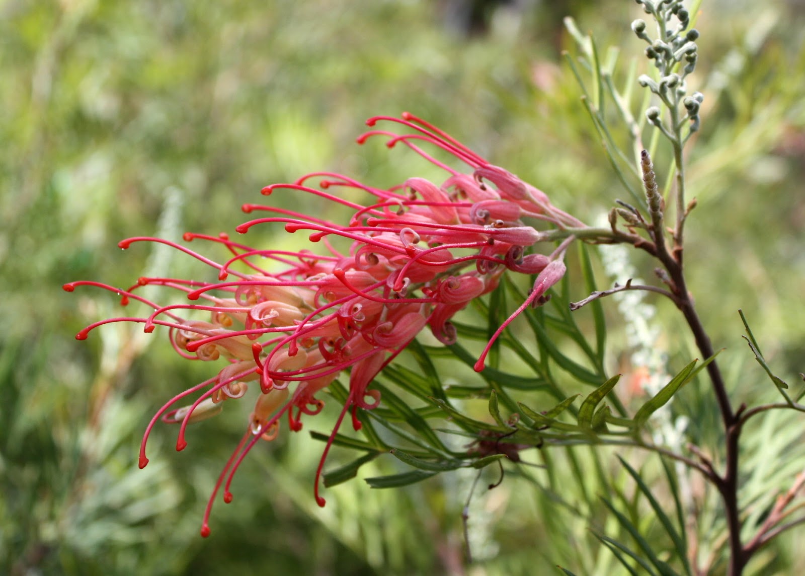 ④ グレベリア・ココナツアイス - この常緑小木は四季咲きですよ。花から蜜が出て、それが大好きな蝶々や小鳥などが集まってきます。ちなみに、我がベランダに飾っています!